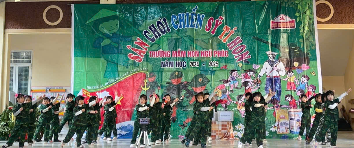 Sáng nay ngày 20/12/2024 trường Mầm non Ngũ Phúc long trọng tổ chức sân chơi "Chiến sĩ tí hon" nhằm giúp trẻ nâng cao thể chất, trẻ thêm mạnh dạn, tự tin, khéo léo, đoàn kết, hợp tác chia sẻ cùng bạn bè. Các bé được đóng vai các chú bộ đội Bộ binh, bộ đội Đặc công và bộ đội Hải quân. Tham dự vào 3 phần chơi: Màn chào hỏi, Chiến sĩ đồng diễn và Tài năng chiến sĩ.